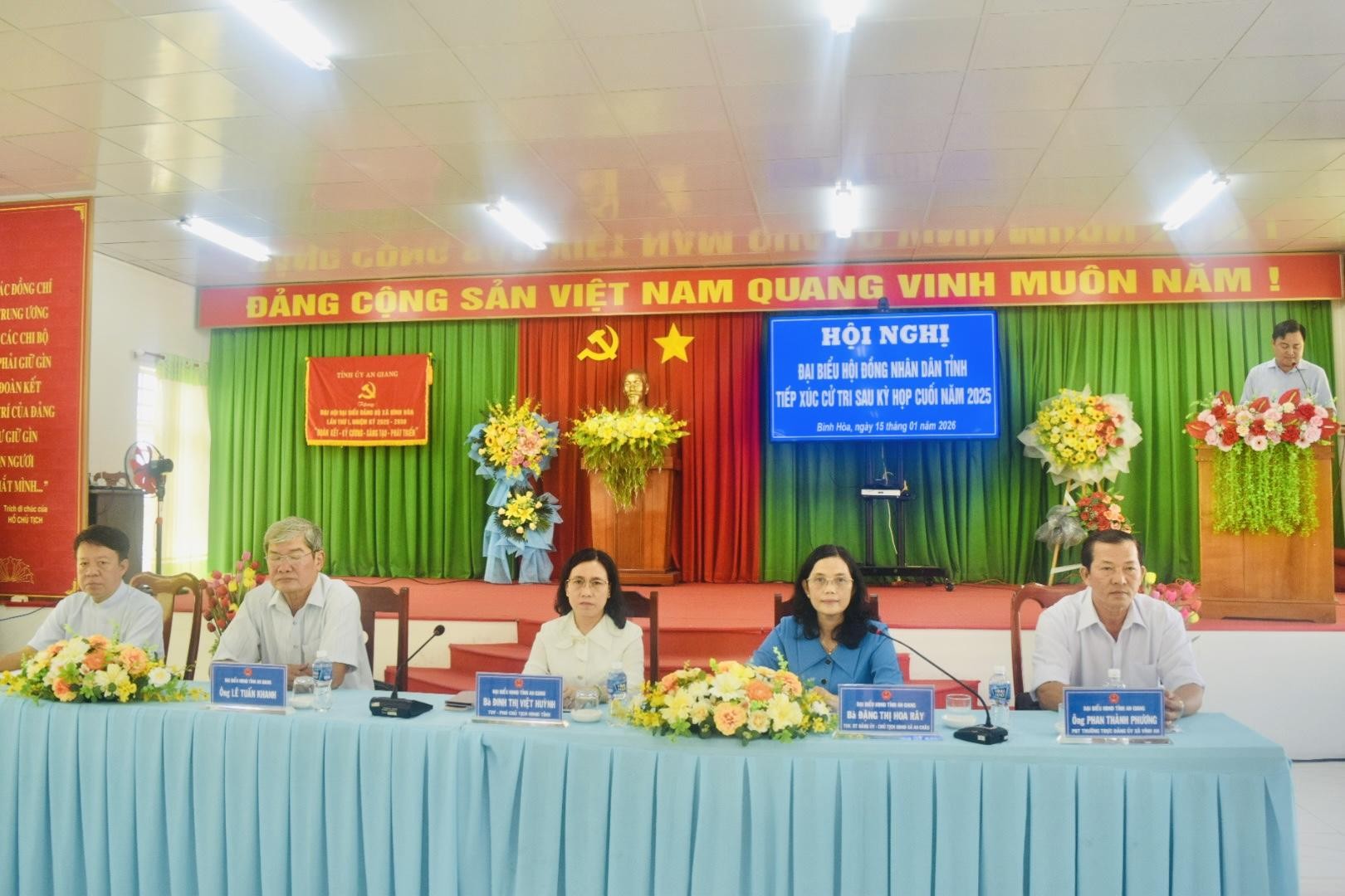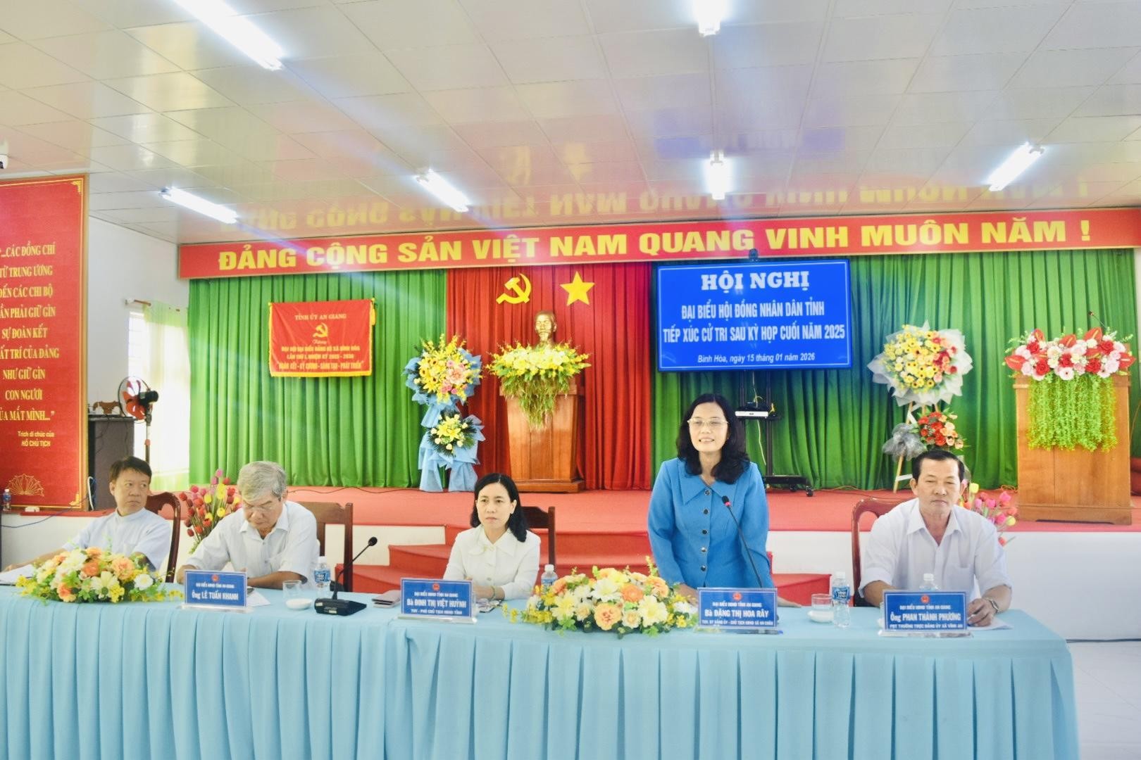 Chiều ngày 15/01/2026, tại hội trường Đảng ủy xã Bình Hòa, đại biểu Hội đồng nhân dân tỉnh An Giang đã có buổi tiếp xúc cử tri sau kỳ họp cuối năm 2025. Tham dự buổi tiếp xúc, về phía đại biểu HĐND tỉnh có bà Đinh Thị Việt Huỳnh, Tỉnh ủy viên, Phó Chủ tịch HĐND tỉnh; ông Lê Tuấn Khanh, đại biểu HĐND tỉnh; bà Đặng Thị Hoa Rây, Tỉnh ủy viên, Bí thư Đảng ủy, Chủ tịch HĐND xã An Châu; ông Phan Thành Phương, Phó Bí thư Đảng ủy xã Vĩnh An; ông Đỗ Cao Quyền, Linh mục Chánh xứ Giáo xứ Nhơn Mỹ. Về phía địa phương có ông Lê Phước Dũng, Bí thư Đảng ủy, Chủ tịch HĐND xã Bình Hòa; ông Trần Hữu Phúc, Phó Bí thư Thường trực Đảng ủy xã; ông Nguyễn Tấn Phong, Phó Bí thư Đảng ủy, Chủ tịch UBND xã Bình Hòa; cùng đại diện lãnh đạo các ban, ngành, đoàn thể xã, Ban Nhân dân các ấp và hơn 70 cử tri trên địa bàn xã tham dự.