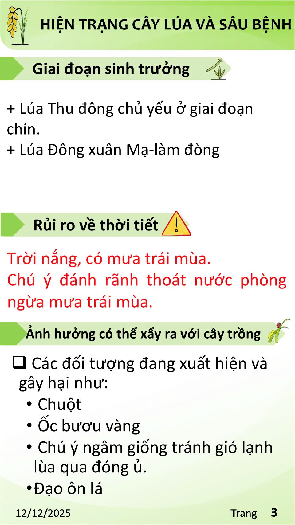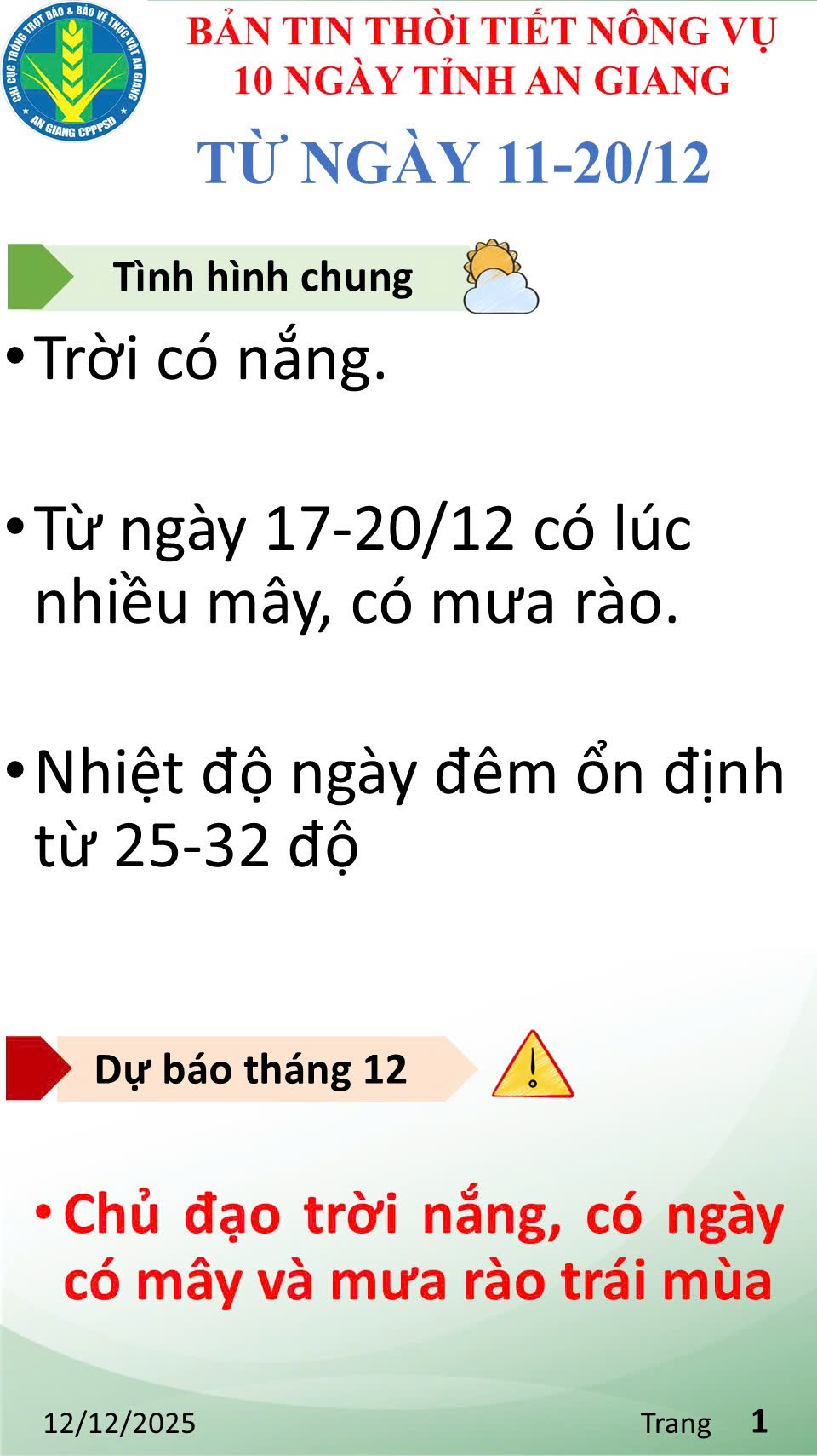 Bản tin thời tiết nông vụ từ ngày 11 đến 20 tháng 12 năm 2025