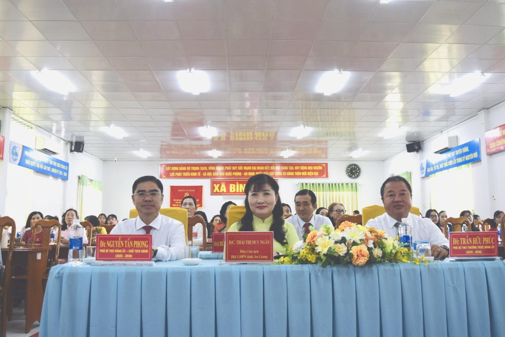 Phát biểu chỉ đạo của đồng chí Thái Thị Duy Ngân – Phó Chủ tịch Hội Liên hiệp Phụ nữ tỉnh An Giang ghi nhận và biểu dương những kết quả nổi bật mà Hội Liên hiệp Phụ nữ xã Bình Hòa đã đạt được trong thời gian qua, đặc biệt là tinh thần đoàn kết, sáng tạo, khắc phục khó khăn của đội ngũ cán bộ, hội viên. Đồng chí đề nghị Ban Chấp hành Hội khóa I tiếp tục bám sát các nhiệm vụ trọng tâm của Hội cấp trên, không ngừng đổi mới nội dung, phương thức hoạt động, hướng mạnh về cơ sở, chăm lo thiết thực đời sống hội viên, phụ nữ; đồng thời phát huy vai trò của phụ nữ trong xây dựng nông thôn mới, chuyển đổi số và phát triển kinh tế gia đình.