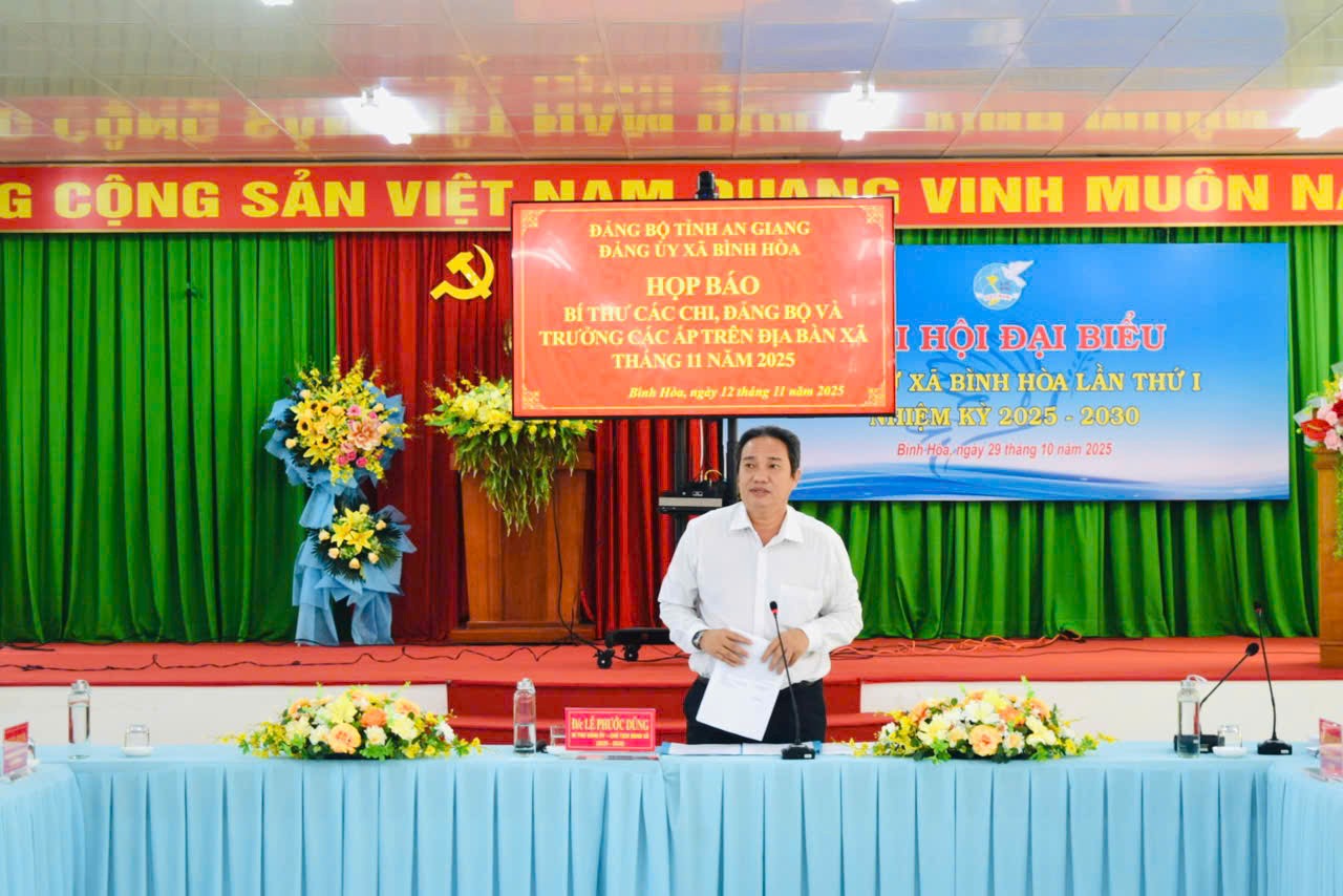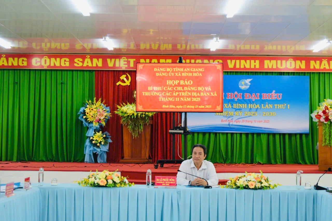 Sáng ngày 12/11/2025, Đảng ủy xã Bình Hòa tổ chức họp báo Bí thư tháng 11 năm 2025 nhằm đánh giá kết quả thực hiện Nghị quyết tháng 10 và triển khai phương hướng, nhiệm vụ trọng tâm trong tháng 11 năm 2025. Tham dự hội nghị có đồng chí Lê Phước Dũng – Bí thư Đảng ủy, Chủ tịch HĐND xã; các đồng chí Ủy viên Ban Thường vụ, Ban Chấp hành Đảng ủy; Bí thư các chi bộ trực thuộc; lãnh đạo các ngành, Mặt trận Tổ quốc, các đoàn thể chính trị - xã hội; cùng Bí thư Chi bộ ấp và Trưởng Ban Nhân dân các ấp trên địa bàn xã.