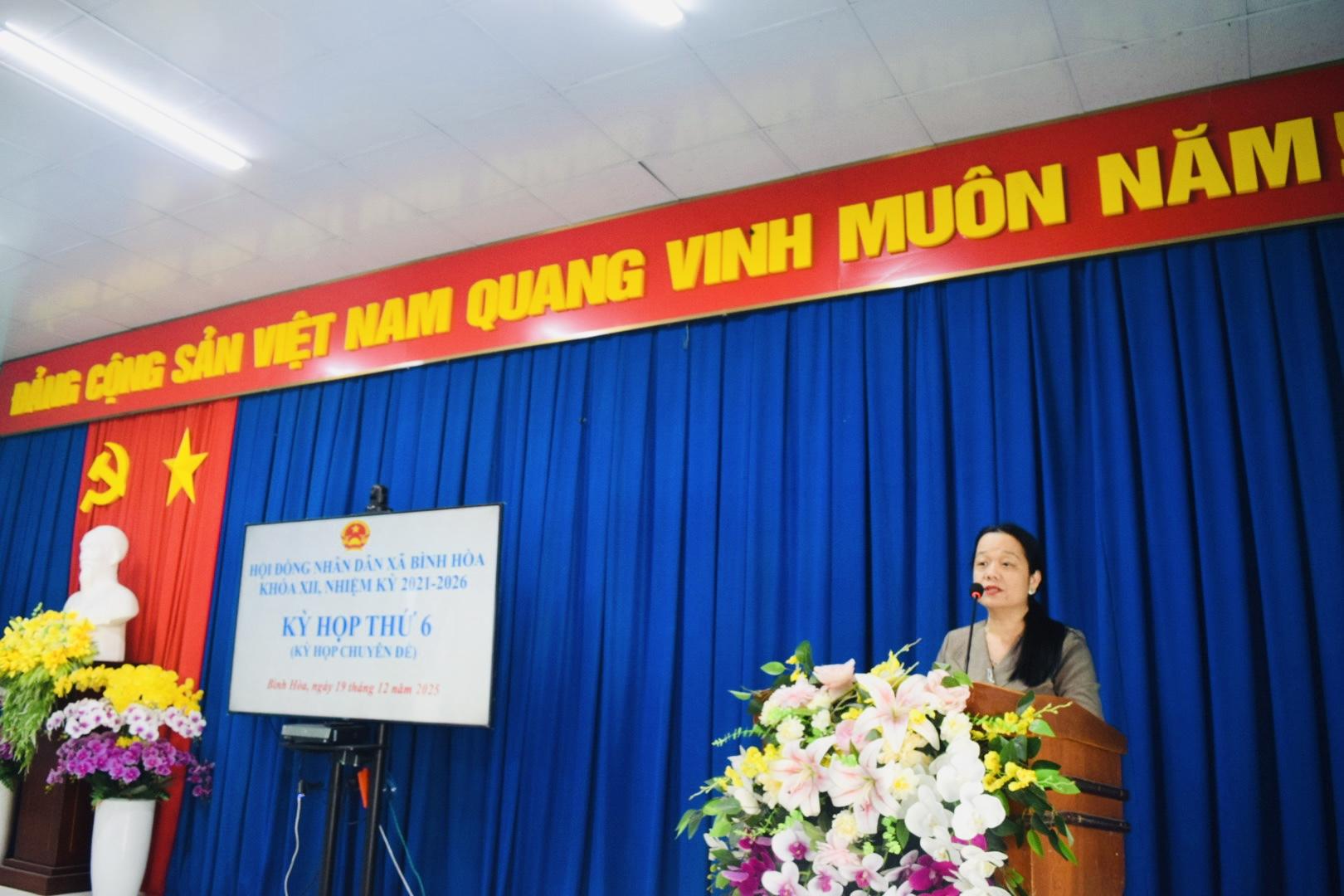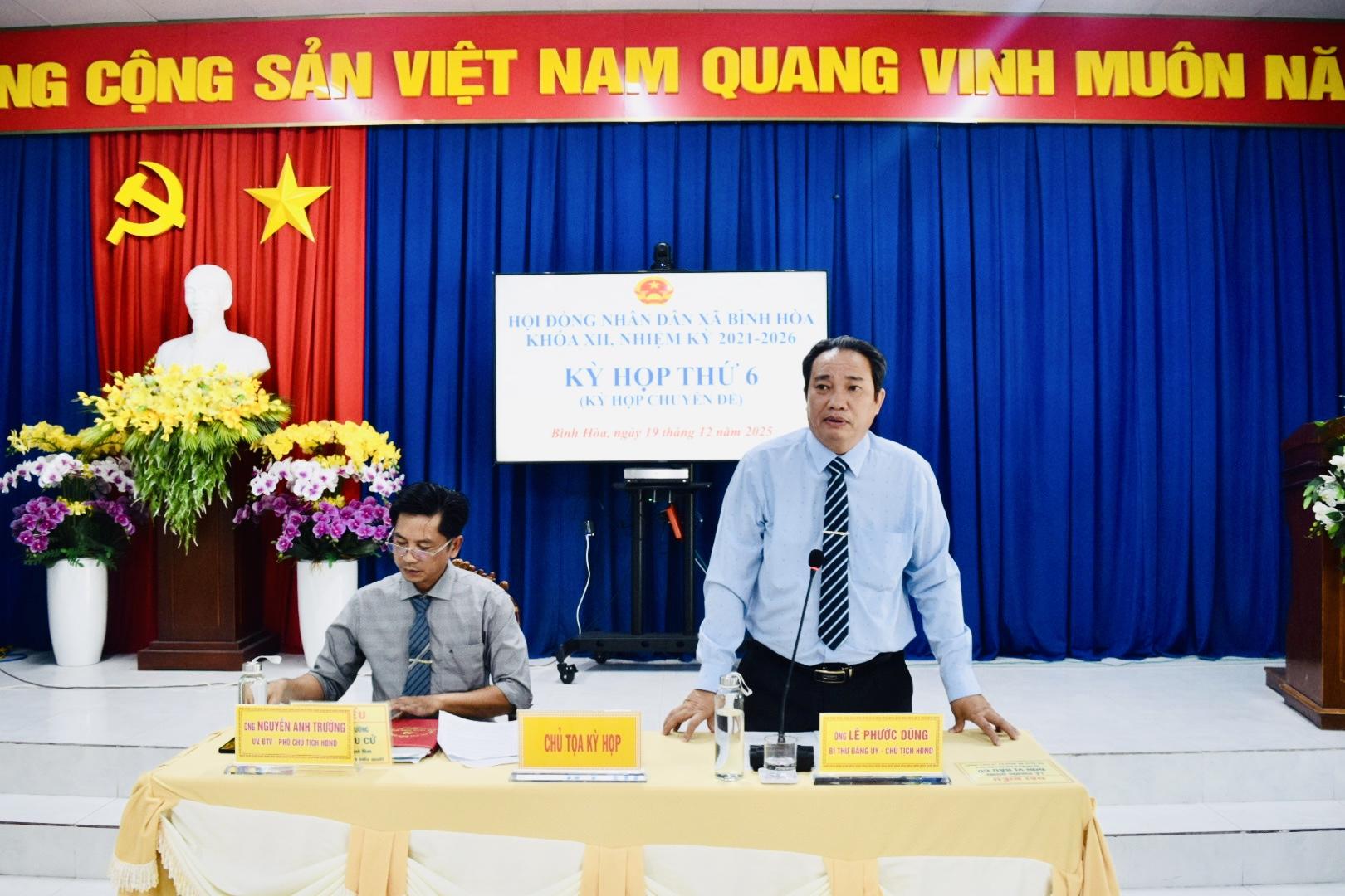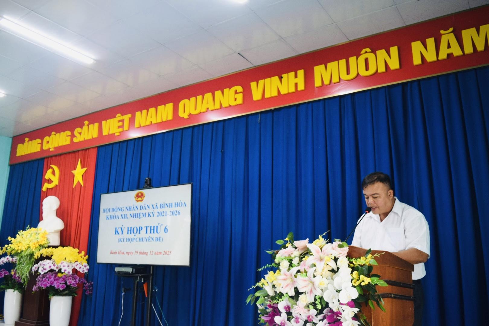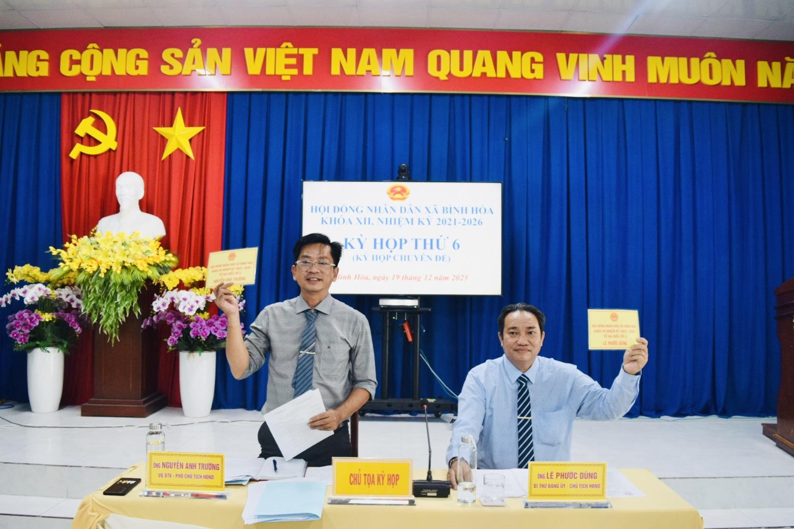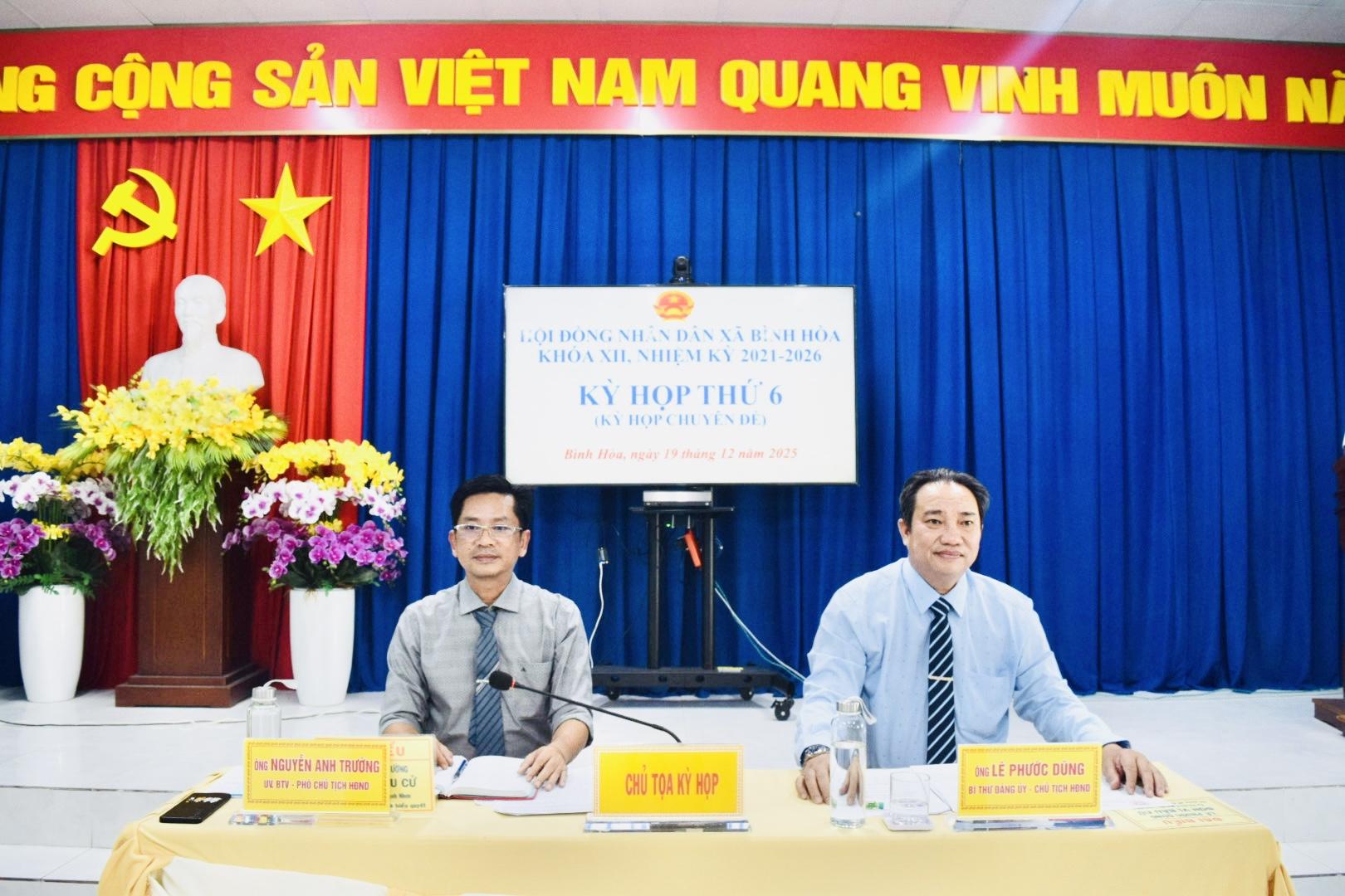 Chiều ngày 19/12/2025, Hội đồng nhân dân xã Bình Hòa khóa XII, nhiệm kỳ 2021–2026 tổ chức kỳ họp thứ 6 (kỳ họp chuyên đề) tại Hội trường UBND xã Bình Hòa nhằm xem xét, quyết định các nội dung quan trọng thuộc thẩm quyền. Kỳ họp do đồng chí Lê Phước Dũng, Bí thư Đảng ủy xã, Chủ tịch HĐND xã và đồng chí Nguyễn Anh Trường, Phó Chủ tịch HĐND xã đồng chủ trì. Tham dự kỳ họp có Thường trực Đảng ủy xã; Chủ tịch, các Phó Chủ tịch, Ủy viên UBND xã; đại diện Ủy ban MTTQ Việt Nam xã; lãnh đạo Công an, Quân sự, các ban, ngành, đoàn thể xã; đại diện Ban Giám hiệu các điểm trường, Trạm Y tế; Trưởng các ấp trên địa bàn xã cùng các đại biểu HĐND xã khóa XII.