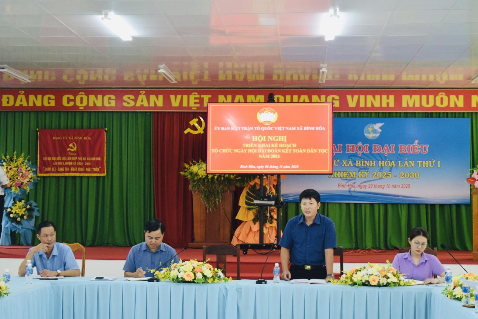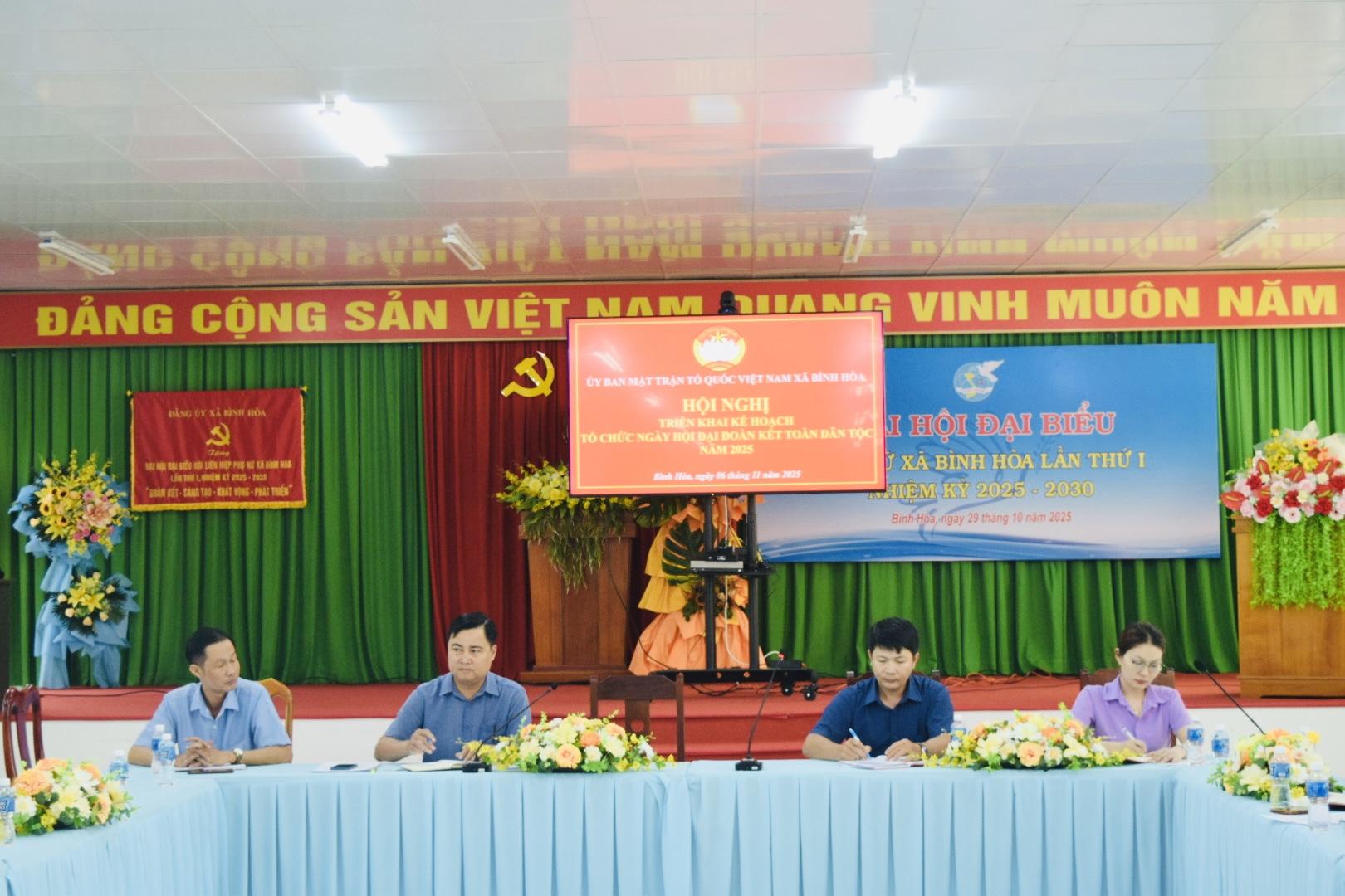 Sáng ngày 06 tháng 11 năm 2025, tại Hội trường Đảng ủy xã Bình Hòa, Ban Thường trực Ủy ban MTTQ Việt Nam xã tổ chức Hội nghị triển khai Kế hoạch tổ chức Ngày hội Đại đoàn kết toàn dân tộc năm 2025. Chủ tịch Ủy ban MTTQ Việt Nam xã – ông Phạm Minh Phong đã chủ trì hội nghị. Tham dự hội nghị có lãnh đạo Ủy ban MTTQVN xã; đại diện Phòng Văn hóa – Xã hội; Trung tâm Dịch vụ tổng hợp; Bí thư Chi bộ, Trưởng Ban nhân dân và Trưởng Ban Công tác Mặt trận các ấp cùng đại diện các ngành, đoàn thể của xã.