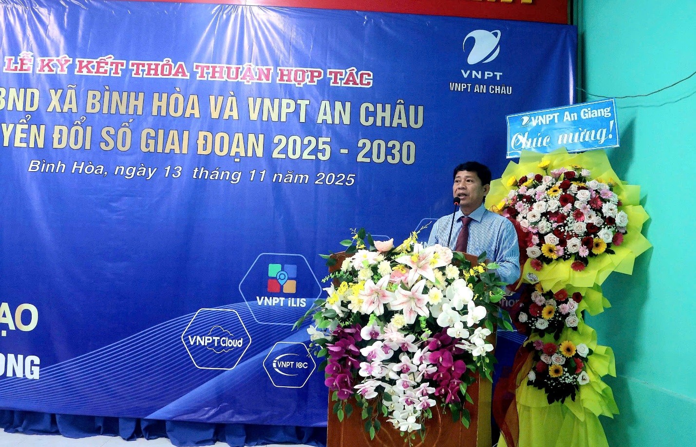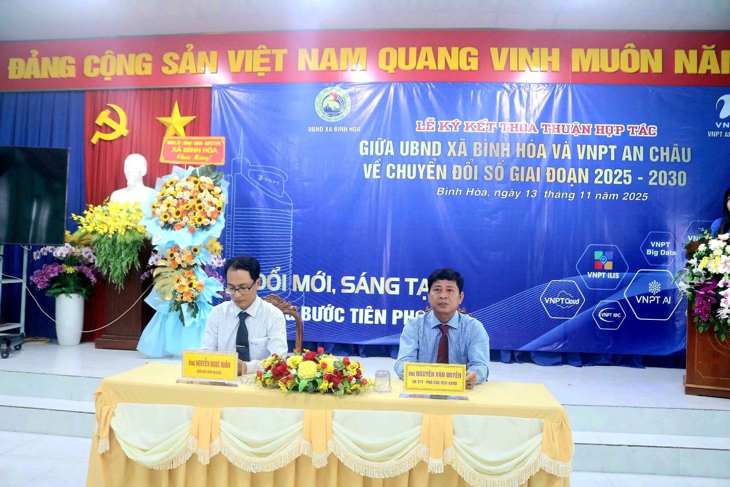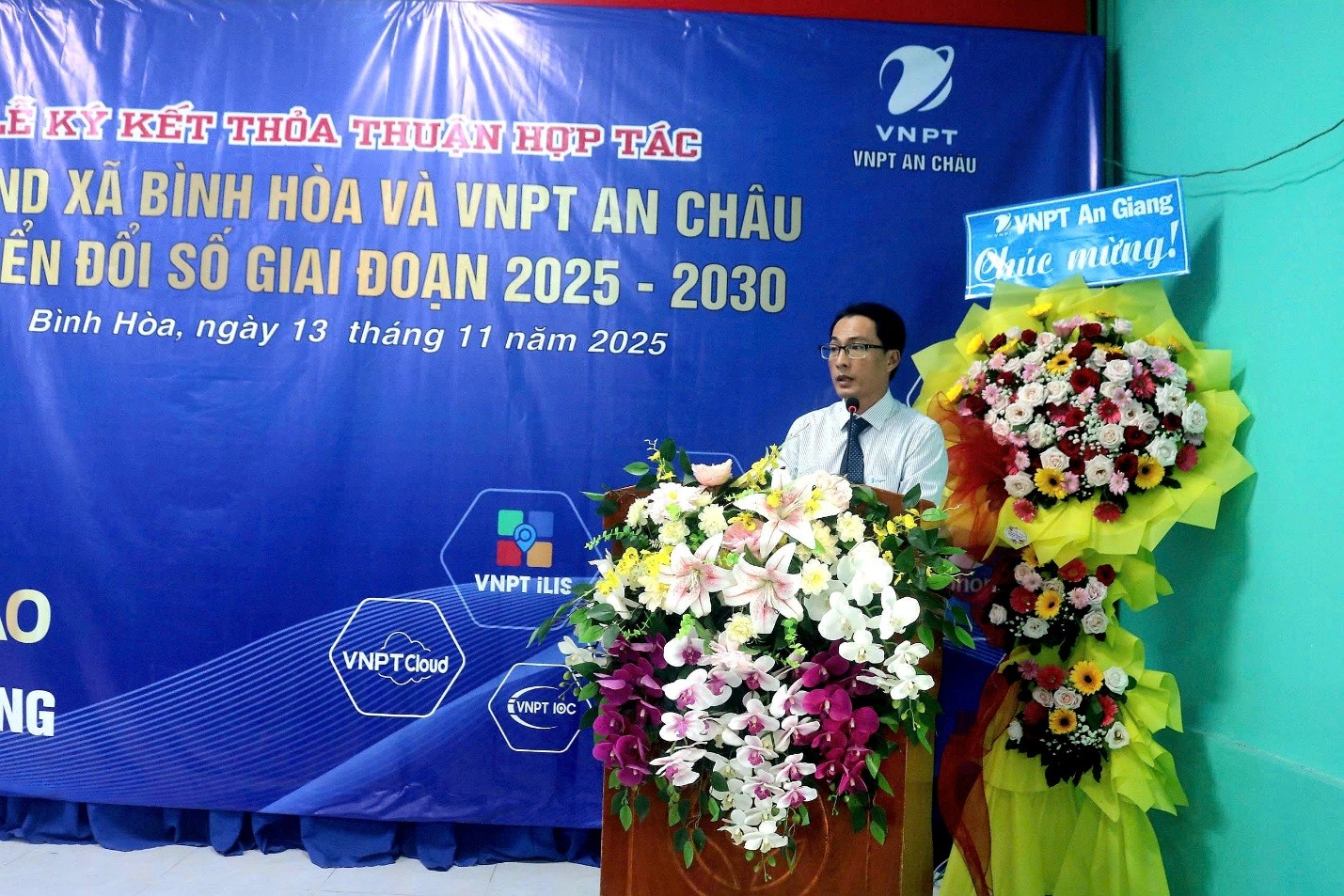 Chiều ngày 13/11/2025, UBND xã Bình Hòa và VNPT An Châu đã tổ chức Lễ ký kế thỏa thuận hợp tác về chuyển đổi số giai đoạn 2025-2030. Tham dự Lễ ký kết lãnh đạo VNPT An Giang; Ông Nguyễn Ngọc Nhân- Giám đốc VNPT An Châu; Ông Nguyễn Anh Trường- Phó Chủ tịch HĐND xã Bình Hòa; Ông Nguyễn Văn Quyền- Phó Chủ tịch UBND xã Bình Hòa; cùng các phòng, ban chuyên môn, Trưởng các ấp trên địa bàn xã.