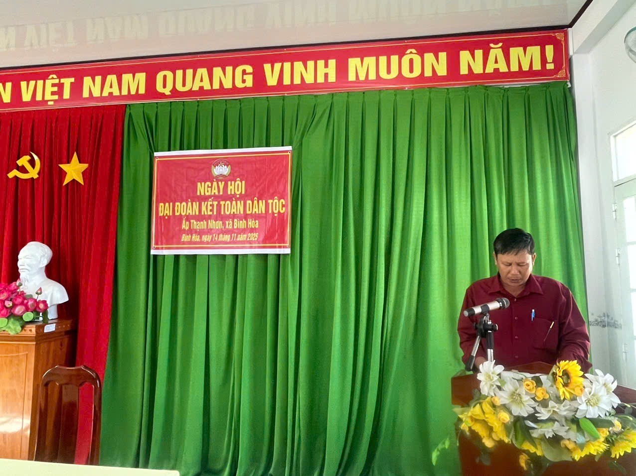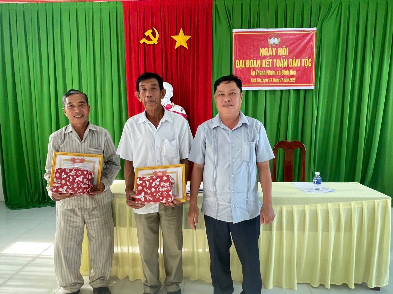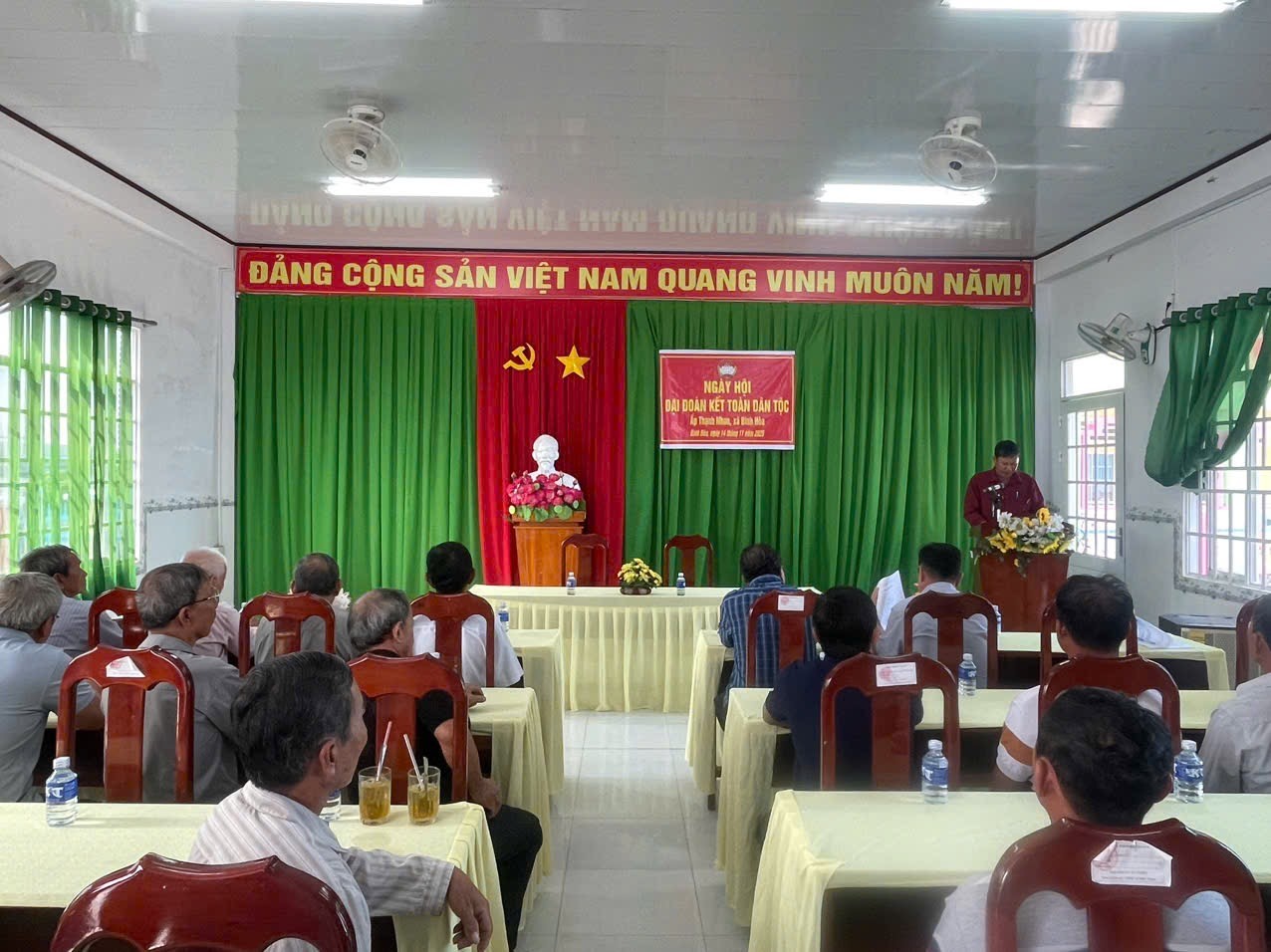 Chiều ngày 14/11/2025, Ấp Thạnh Nhơn, xã Bình Hòa đã tổ chức Ngày hội Đại đoàn kết toàn dân tộc năm 2025 trong không khí phấn khởi, ấm áp tình làng nghĩa xóm. Đây là hoạt động thiết thực chào mừng kỷ niệm 95 năm Ngày thành lập Mặt trận Dân tộc Thống nhất Việt Nam, góp phần củng cố khối đại đoàn kết và phát huy vai trò của cộng đồng dân cư trong xây dựng nông thôn mới. Tham dự ngày hội có đồng chí Trần Hữu Phúc – Phó Bí thư Thường trực Đảng ủy xã Bình Hòa, cùng đại diện các ngành, đoàn thể xã và đông đảo bà con nhân dân ấp Thạnh Nhơn.