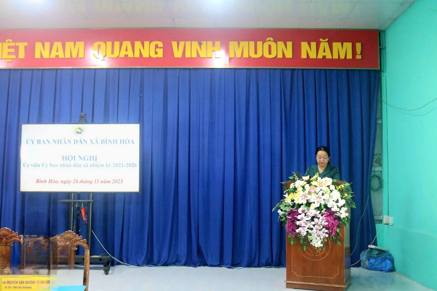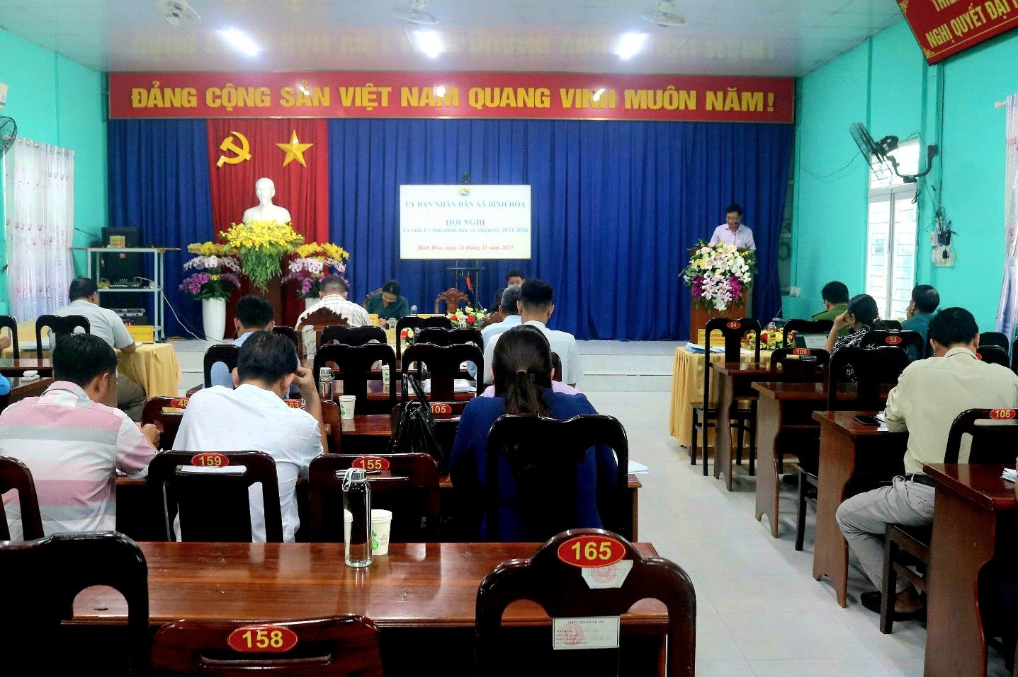 Chiều ngày 26/11/2025, UBND xã Bình Hòa tổ chức họp ủy viên UBND nhiệm kỳ 2021-2026, nhằm đánh giá tình hình thực hiện nhiệm vụ phát triển kinh tế- xã hội năm 2025 và phương hướng nhiệm vụ năm 2026; triển khai Kế hoạch thực hiện các Nghị quyết quan trọng của Chính phủ, Chương trình hành động của Tỉnh ủy. Tham dự và đồng chủ trì Hội nghị đồng chí Nguyễn Viết Thanh- Phó Chủ tịch UBND xã và đồng chí Nguyễn Văn Quyền- Phó Chủ tịch UBND xã; các đồng chí ủy viên UBND xã nhiệm kỳ 2021-2026; lãnh đạo các phòng, ban chuyên môn, trưởng các ấp trên địa bàn xã.