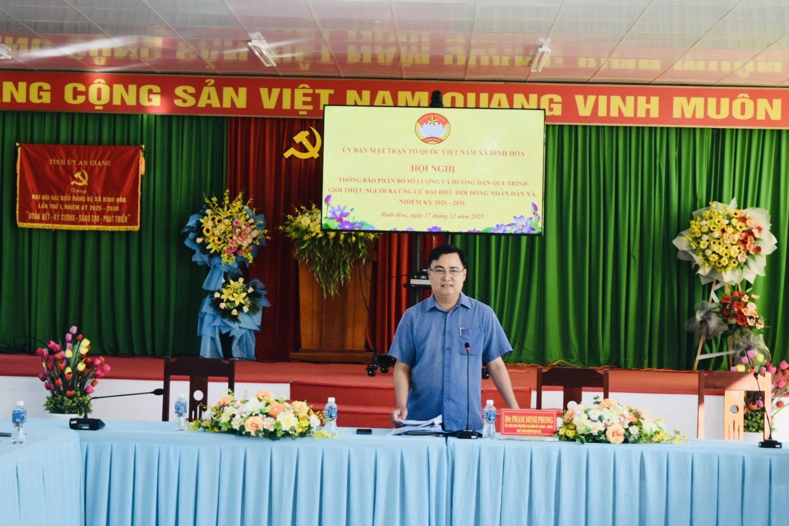 Sáng ngày 17/12, Ban Thường trực Ủy ban MTTQ Việt Nam xã Bình Hòa tổ chức hội nghị thông báo phân bổ số lượng người được giới thiệu ứng cử đại biểu Hội đồng nhân dân xã và hướng dẫn quy trình giới thiệu người ứng cử đại biểu HĐND xã nhiệm kỳ 2026–2031. Hội nghị do đồng chí Phạm Minh Phong, Chủ tịch Ủy ban MTTQ Việt Nam xã Bình Hòa, chủ trì.