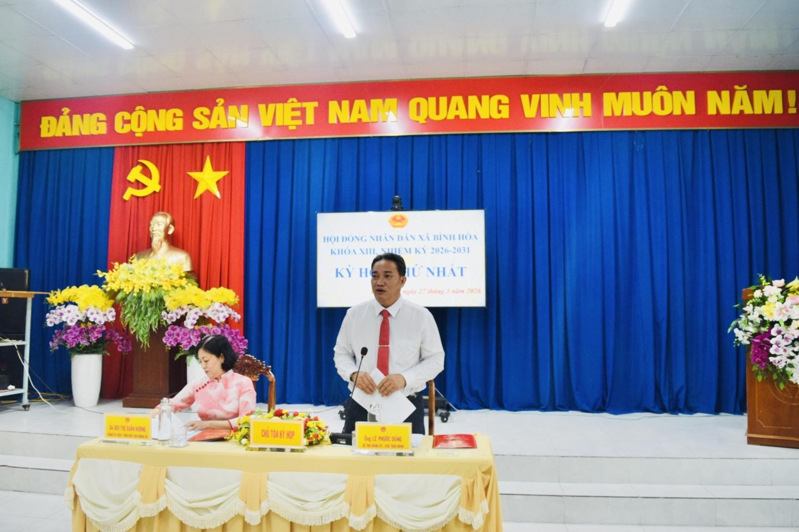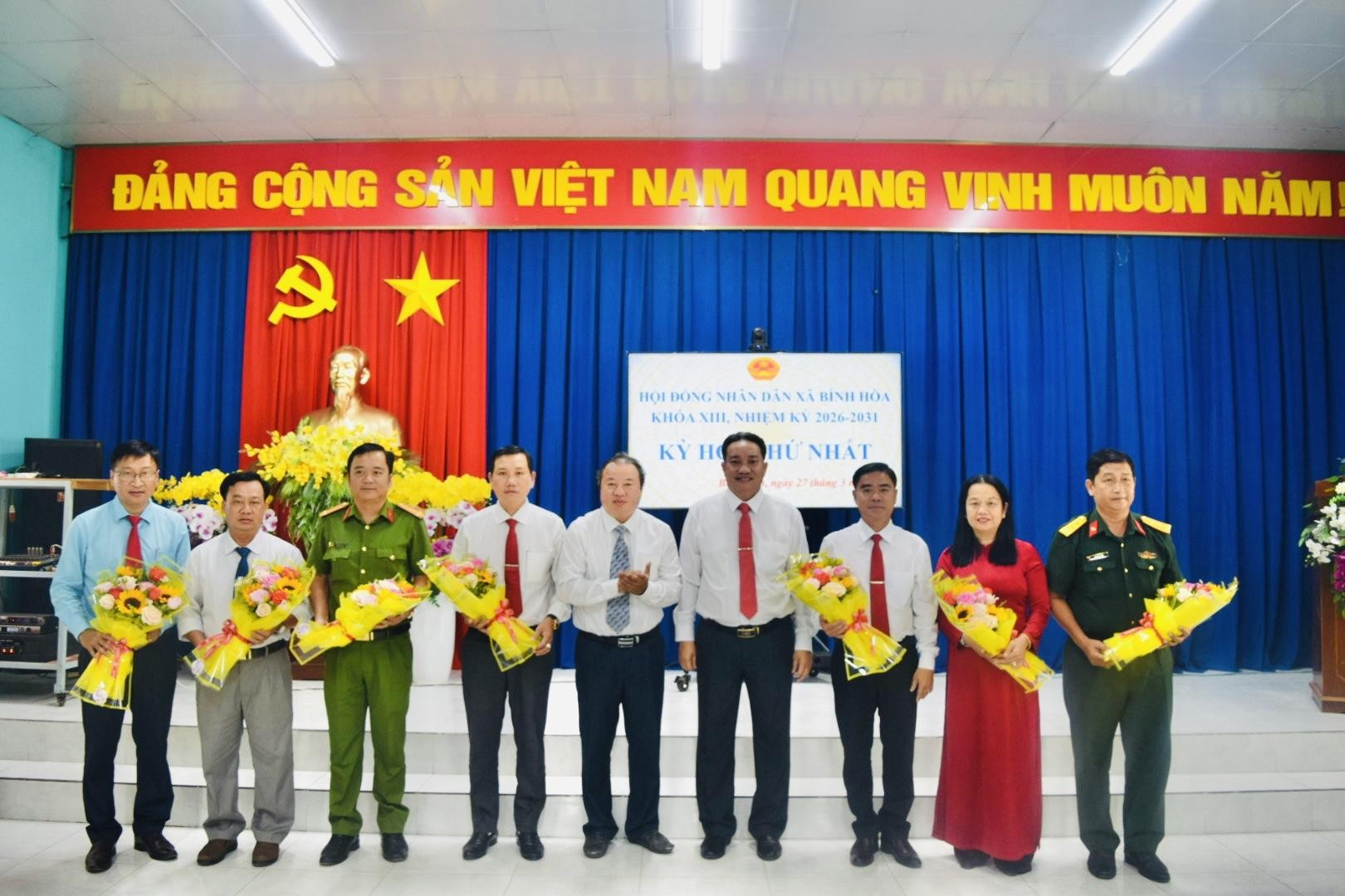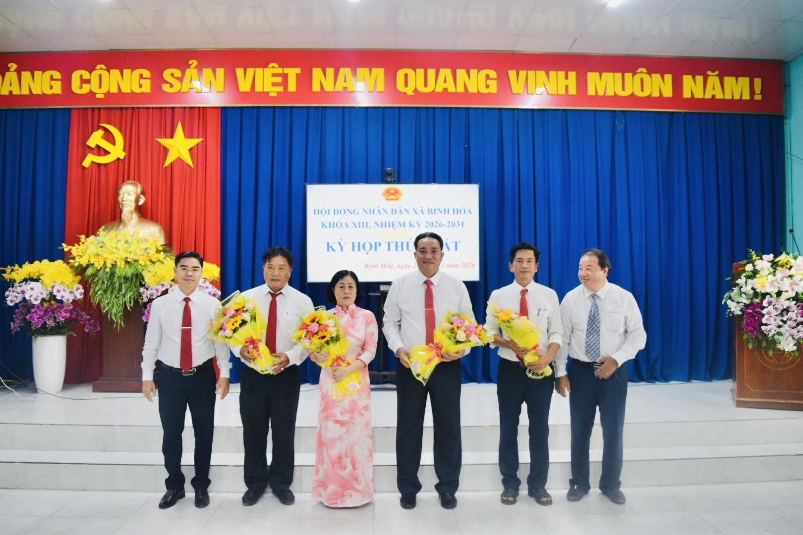 Chiều 26/3, HĐND xã Bình Hòa khóa XIII, nhiệm kỳ 2026–2031 tổ chức Kỳ họp thứ nhất nhằm kiện toàn tổ chức bộ máy chính quyền địa phương sau cuộc bầu cử đại biểu Quốc hội khóa XVI và đại biểu HĐND các cấp nhiệm kỳ 2026–2031. Đến dự có đồng chí Lê Phước Dũng – Bí thư Đảng ủy xã, chủ tịch HĐND xã, đồng chí Trần Hữu Phúc – Phó Bí thư Thường trực Đảng ủy xã; đồng chí Nguyễn Tấn Phong – Phó Bí thư Đảng ủy, Chủ tịch UBND xã; cùng Thường trực Đảng ủy, HĐND, lãnh đạo UBND, Ủy ban MTTQ Việt Nam xã và các đại biểu HĐND xã Bình Hòa khóa XIII, nhiệm kỳ 2026–2031.