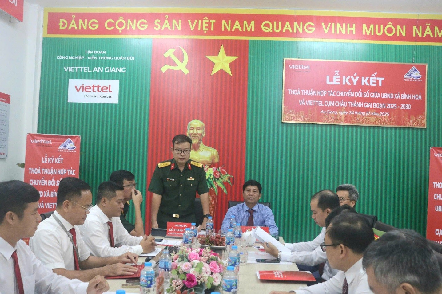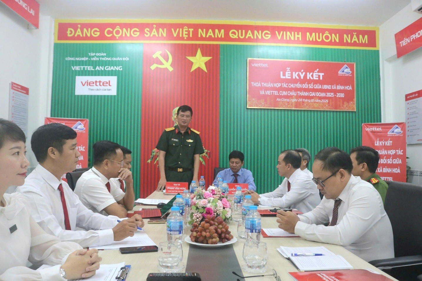 Chiều ngày 24/10/2025, UBND xã Bình Hòa và Viettel An Giang đã tổ chức Lễ ký kế thỏa thuận hợp tác chuyển đổi số giai đoạn 2025-2030. Tham dự Lễ ký kết Trung tá Đỗ Thanh Tuấn- Giám đốc Viettel An Giang; Đại tá Phạm Văn Hưng- Phó Giám đốc Viettel An Giang; Ông Nguyễn Văn Quyền- Phó Chủ tịch UBND xã Bình Hòa; cùng các phòng, ban chuyên môn của xã.