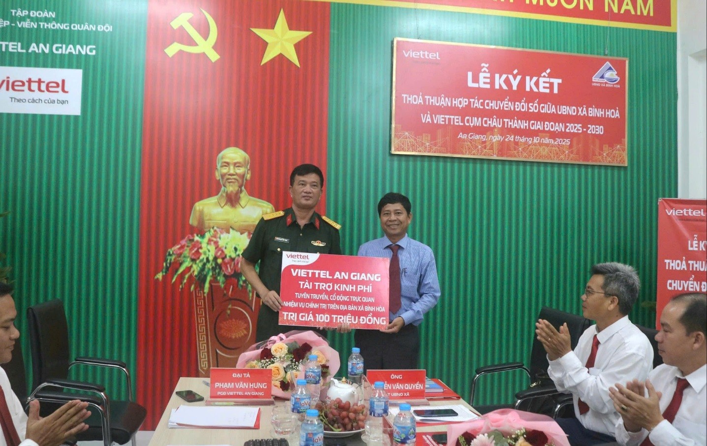 Nhân dịp Lễ ký kết, Viettel An Giang đã tài trợ kinh phí tuyên truyền cổ động trực quan nhiệm vụ chính trị trên địa bàn xã Bình Hòa trị giá 100 triệu đồng; tài trợ kinh phí 5.000 biên lai điển tữ 01 năm chữ ký số trị giá 5 triệu đồng./.