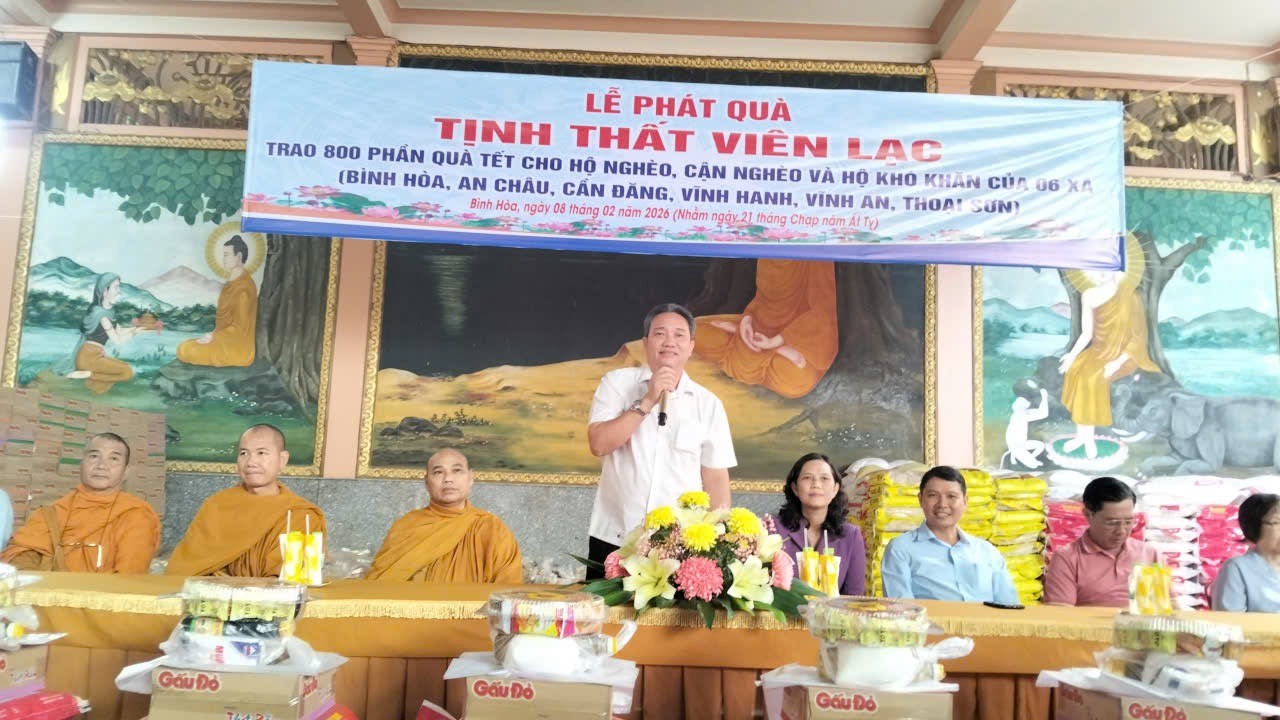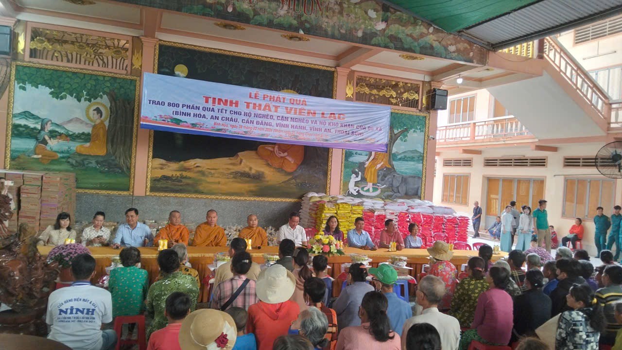 Sáng ngày 8 tháng 2 năm 2026, Tịnh thất Viên Lạc phối hợp với chính quyền địa phương tổ chức Lễ phát quà Tết cho hộ nghèo, cận nghèo và hộ có hoàn cảnh khó khăn trên địa bàn các xã Bình Hòa, An Châu, Cần Đăng, Vĩnh Hanh, Vĩnh An và Thoại Sơn. Tham dự buổi lễ có đại diện lãnh đạo các xã cùng đông đảo bà con nhân dân đến nhận quà trong không khí ấm áp, nghĩa tình những ngày đầu xuân.