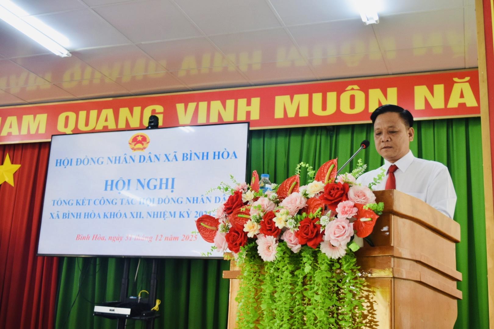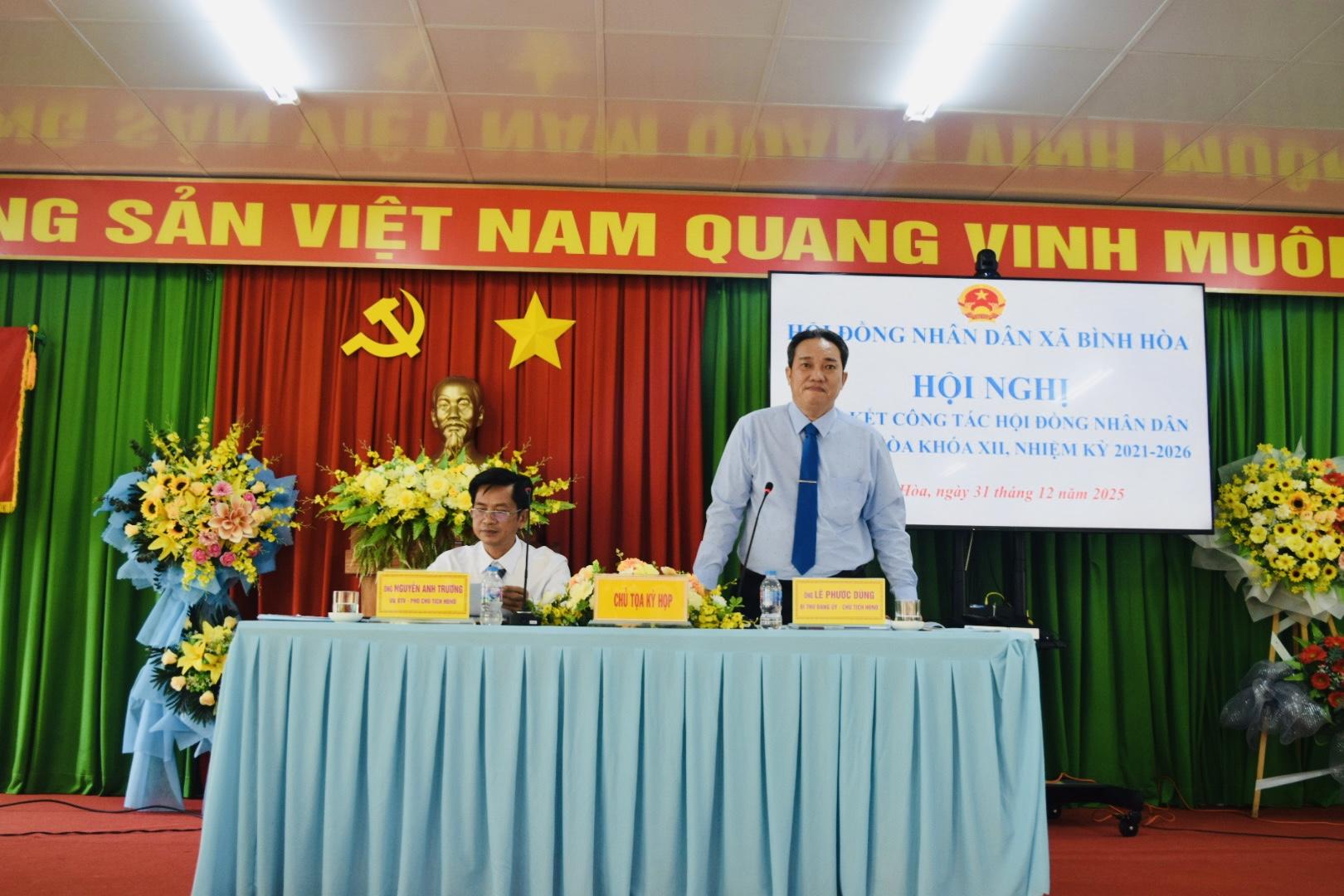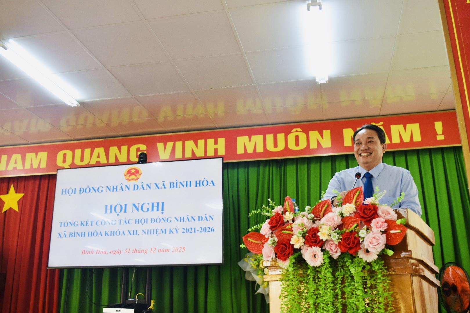 Chiều ngày 31/12, tại Hội trường Đảng ủy xã Bình Hòa, Hội đồng nhân dân xã tổ chức hội nghị tổng kết nhiệm kỳ HĐND xã khóa XII, nhiệm kỳ 2021–2026. Tham dự hội nghị có ông Lê Phước Dũng – Bí thư Đảng ủy, Chủ tịch HĐND xã, các đồng chí trong Thường trực HĐND, đại biểu HĐND xã, đại diện UBND, Ủy ban MTTQ Việt Nam xã, lãnh đạo các ban ngành, đoàn thể và đại biểu các ấp.