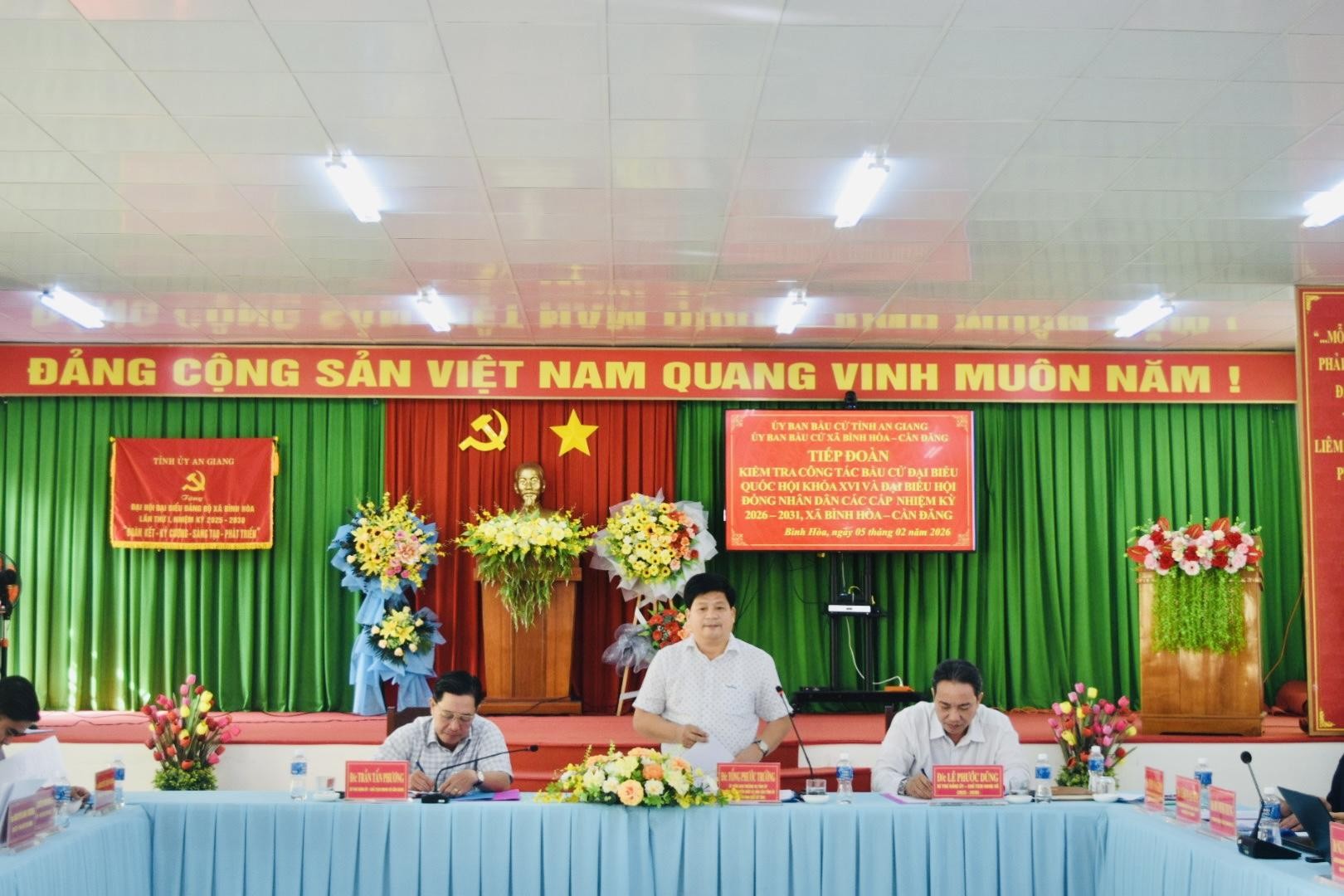 Chiều ngày 05/02/2026, tại Hội trường Đảng ủy xã Bình Hòa, Đoàn kiểm tra công tác chuẩn bị bầu cử đại biểu Quốc hội khóa XVI và đại biểu Hội đồng nhân dân các cấp nhiệm kỳ 2026 – 2031 của tỉnh An Giang đã tổ chức làm việc với xã Bình Hòa và xã Cần Đăng. Đoàn kiểm tra do đồng chí Tống Phước Trường, Ủy viên Ban Thường vụ Tỉnh ủy, Trưởng Ban Tuyên giáo và Dân vận Tỉnh ủy, Ủy viên Ủy ban bầu cử tỉnh, Trưởng Tiểu ban Thông tin, tuyên truyền làm Trưởng đoàn. Tham gia Đoàn có đại diện lãnh đạo các sở, ngành tỉnh và thành viên các tiểu ban giúp việc của Ủy ban bầu cử tỉnh. Tiếp và làm việc với Đoàn kiểm tra có đại diện lãnh đạo xã Bình Hòa và xã Cần Đăng, trong đó có đồng chí Lê Phước Dũng, Bí thư Đảng ủy, Chủ tịch Hội đồng nhân dân xã Bình Hòa; đồng chí Trần Tấn Phương, Bí thư Đảng ủy, Chủ tịch Hội đồng nhân dân xã Cần Đăng, cùng các đồng chí trong Ban Thường vụ Đảng ủy, Hội đồng nhân dân, Ủy ban nhân dân và Ủy ban bầu cử hai xã.